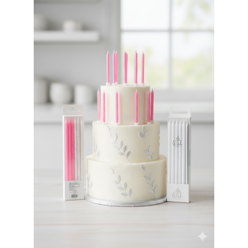 Add some fun detail to your cake with these glitter candles. They come with holders for inserting the candles into cakes.